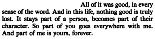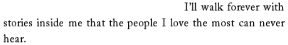 c. "They tell you you'll forget how it used to be. You'll get used to it, that it's better to move on. They don't realize you can't. You're not the same person anymore." ( x )