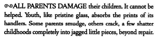 3. All parents damage their children. Youth, like pristine glass, absorbs the prints of its handlers. Some parents smudge, others crack, a few shatter childhoods completely into jagged little pieces, beyond repair. (M. Alborn)